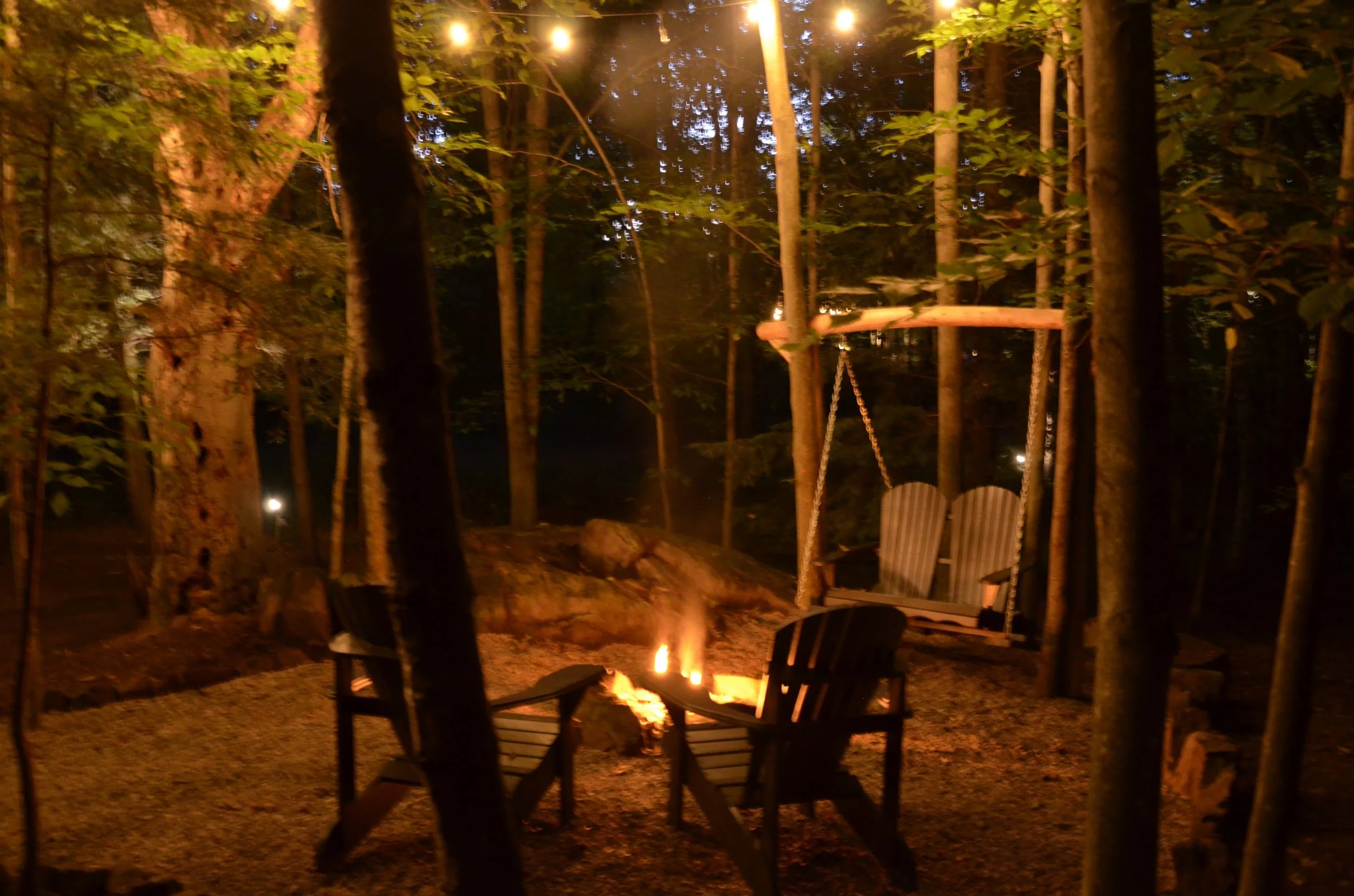 Outdoors you are ensconced in a woodland paradise filled with romantic touches that surround you with love. The enchanted forest has meandering trails following the river and continuing throughout the woodland ravine filled with secret gardens and viewing vistas, your love lock garden, bonfire pits, and river front beach with a cabana and kayaks for you to explore the river.